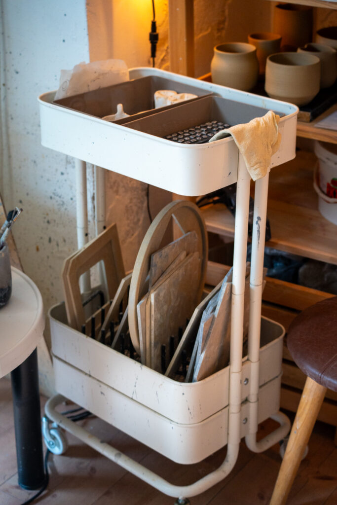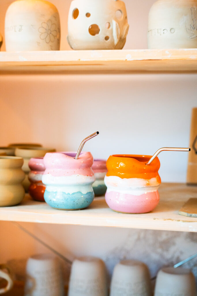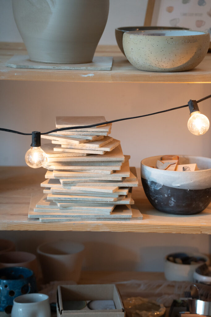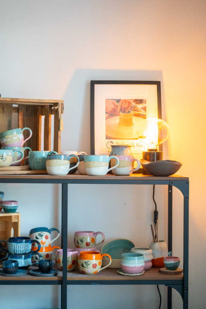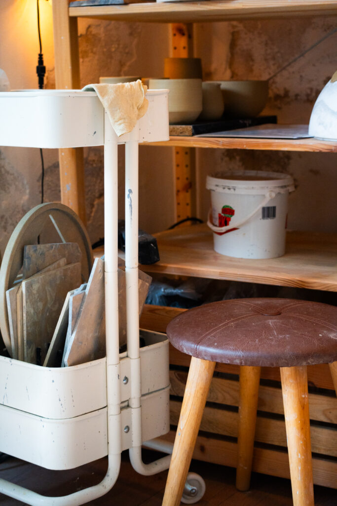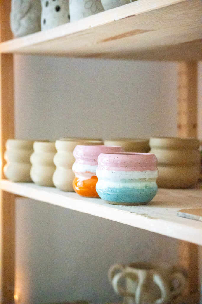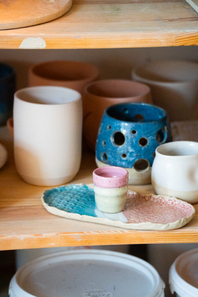 In den Regalen ihrer Werkstatt stehen unzählige Stücke: fertig glasierte, frisch getrocknete und Werke, die noch auf den Brand warten. Auf die Frage nach ihrem Lieblingsstück antwortet sie ohne Zögern: „Am liebsten mache ich Tassen – davon kann man nie genug haben und sich jeden Tag daran erfreuen.“